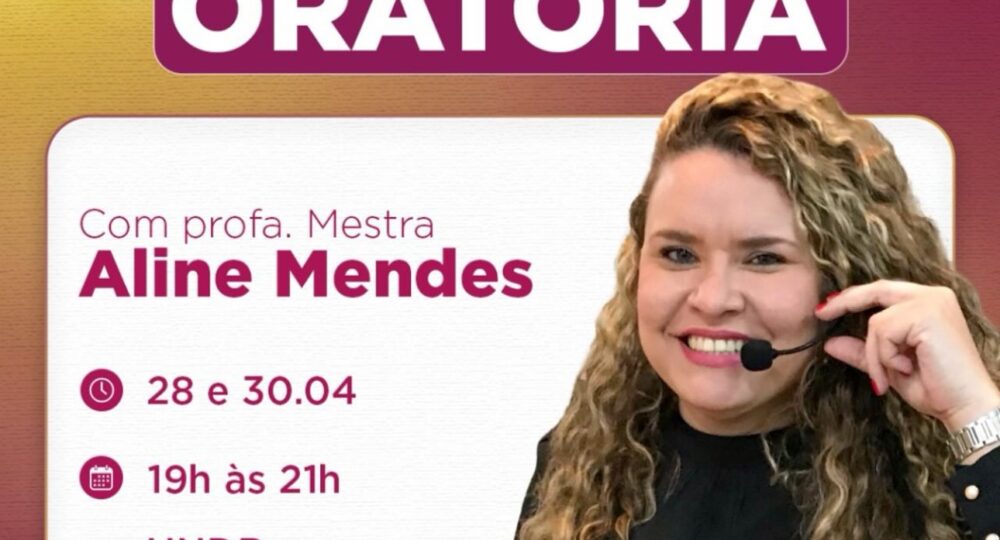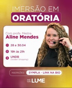 Nos dias 28 e dia 30 de abril, na UNDB do Golden Shopping, a professora Aline Mendes realiza o curso Imersão em ORATÓRIA, voltado para quem deseja falar bem em público e nas comunicações interpessoais, em geral.