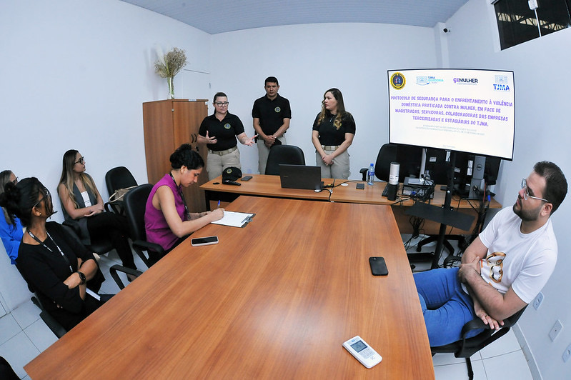 Em seguida, para esclarecer dúvidas sobre os protocolos do sistema de segurança do Poder Judiciário, a sargento Samara deu continuidade à exposição, apresentando as ferramentas de incentivo à denúncia e combate à violência, com adoção de um acolhimento humanizado e sigiloso.
