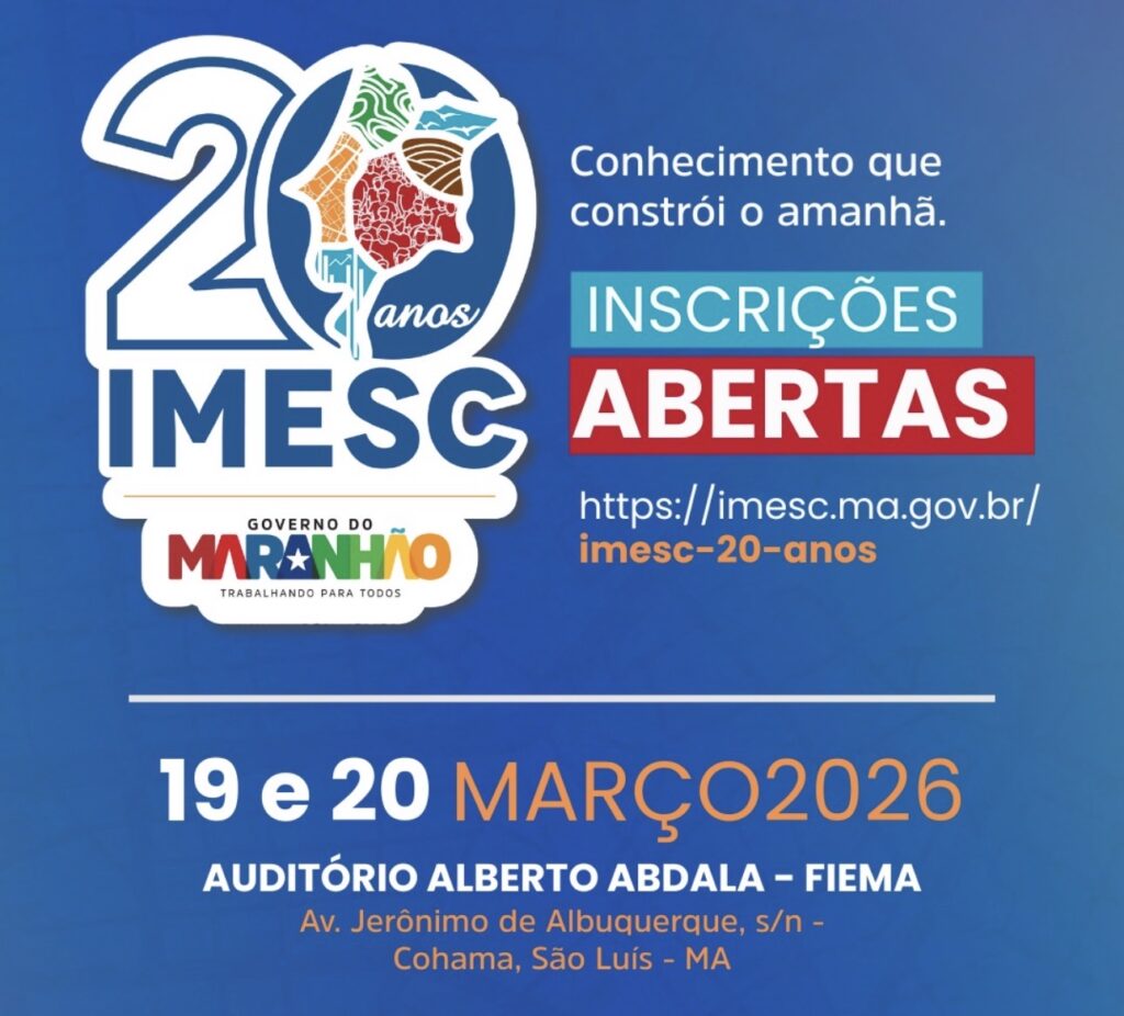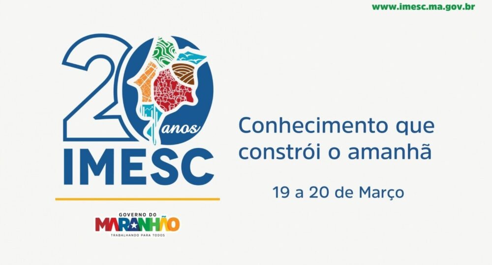 O Instituto Maranhense de Estudos Socioeconômicos e Cartográficos (Imesc) realizará, nos dias 19 e 20 de março de 2026, o evento comemorativo “Imesc 20 anos: Conhecimento que constrói o amanhã”, no Auditório Alberto Abdala, da Federação das Indústrias do Estado do Maranhão (FIEMA), em São Luís.