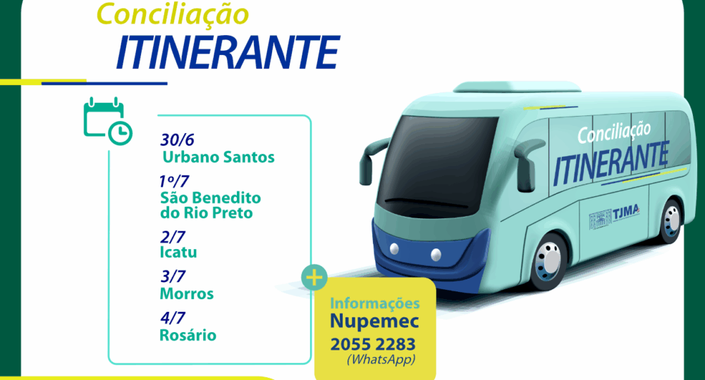 O Tribunal de Justiça do Maranhão (TJMA) realiza nova edição do projeto Conciliação Itinerante, no período de 30/6 a 4/7, com atendimentos jurídicos gratuitos à população por meio de diálogo e formalização de acordos. O ônibus da conciliação vai atender as cidades de Urbano Santos (30/6), São Benedito do Rio Preto (1º/7), Icatu (2/7), Morros (3/7), e Rosário (4/7). Ação integra a Semana Estadual de Conciliação realizada pelo Poder Judiciário ao longo da próxima semana.