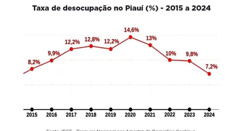 O Piauí encerrou 2024 com a menor taxa de desocupação de sua história, segundo dados da Pesquisa Nacional por Amostra de Domicílios Contínua (PNADC), divulgados hoje pelo IBGE. O índice ficou em 7,2%, uma redução de 2,6 pontos percentuais em relação a 2023.