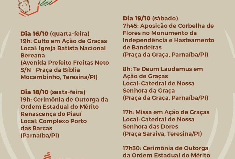 Ainda no sábado (19), as comemorações retornam à capital Teresina. Às 17h, será realizada Missa em Ação de Graças, na Catedral de Nossa Senhora das Dores, na Praça Saraiva. Em seguida, às 17h30, a programação especial se encerra com nova Cerimônia de Outorga da Ordem Estadual do Mérito Renascença, a ser realizada no Theatro 4 de Setembro, na Praça Pedro II.