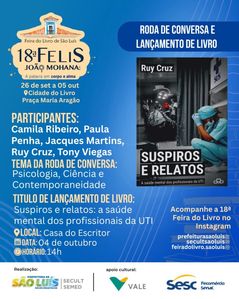 No livro “Suspiros e Relatos: A Saúde Mental dos Trabalhadores da UTI”, o psicólogo Ruy Ribeiro Moraes Cruz chama à reflexão sobre saúde mental. Conta da sua experiência enquanto atuava na época da pandemia diante de profissionais que estavam na linha de frente da guerra contra o vírus, e que ao mesmo tempo precisavam sobreviver em meio a toda aquela situação. São relatos tocantes de quem viu, ouviu e viveu muita coisa. O livro será lançado dia 4 de outubro , na Livraria AMEI, no São Luís Shopping.