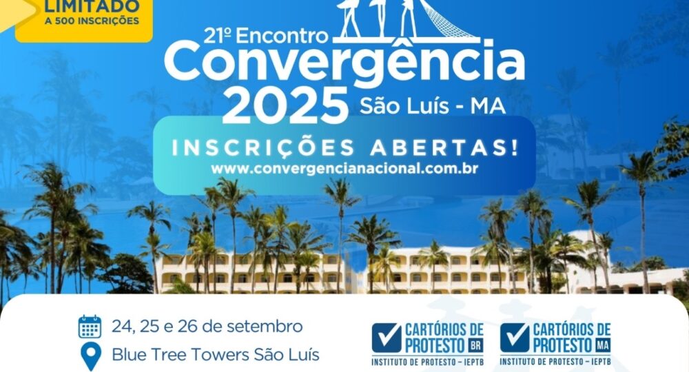 Organizado pelo Instituto de Estudos de Protesto de Títulos do Brasil (IEPTB), com apoio da sua Seção no Maranhão, o 21º Encontro Convergência 2025 pretende reunir tabeliãs e tabeliães de todo o país, além de autoridades do Poder Judiciário. Também podem participar profissionais que atuam nas áreas financeira, de crédito, de cobrança, de recuperação de ativos e de setores da economia com relação à atividade do protesto.