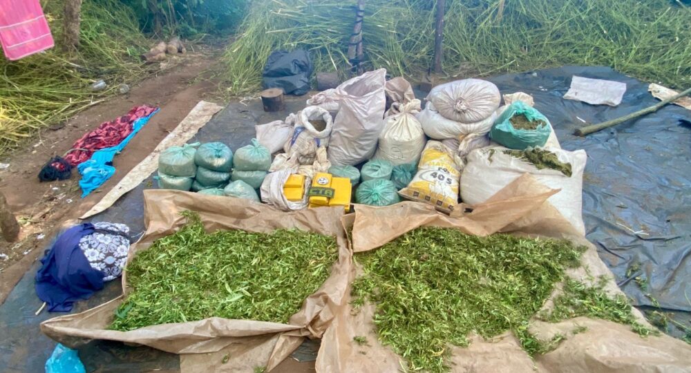 Além da grande quantidade de pés de maconha, foram apreendidos dois sacos de sementes de maconha, fertilizantes, um pulverizador, máquinas para prensagem, macacos hidráulicos e uma espingarda calibre 32. Também foram encontrados 30 sacos de maconha já seca e 20 tabletes prensados.