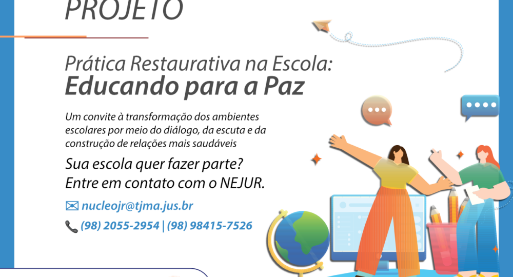 O Tribunal de Justiça do Maranhão (TJMA), por meio do Núcleo Estadual de Justiça Restaurativa (NEJUR), convida as instituições de ensino a integrarem o movimento das Escolas Restaurativas, por meio do projeto Prática Restaurativa na Escola: Educando para a Paz, fortalecendo uma cultura de cuidado, escuta qualificada e corresponsabilização coletiva.