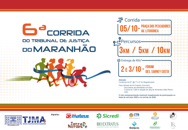- Comparecer no dia da corrida. A ausência sem justificativa médica implicará impedimento de participar da festa de encerramento do Mês do Servidor e da 7ª Corrida do TJMA.