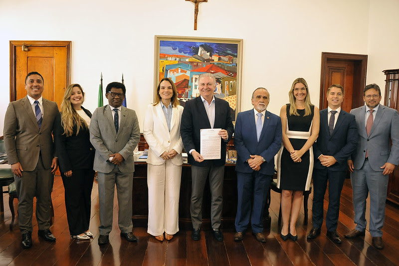 A imagem mostra uma reunião formal em uma sala de conferências. Há nove pessoas sentadas ao redor de uma mesa de vidro, com uma pessoa adicional em pé ao lado da mesa. A pessoa sentada no centro da mesa parece estar assinando um documento. Há bandeiras do Brasil e de outro estado ou país ao fundo, ao lado de uma pintura colorida na parede. Na parede à esquerda, há quatro certificados ou prêmios emoldurados. A mesa tem copos de água e xícaras de café. A sala é iluminada por uma janela com persianas.