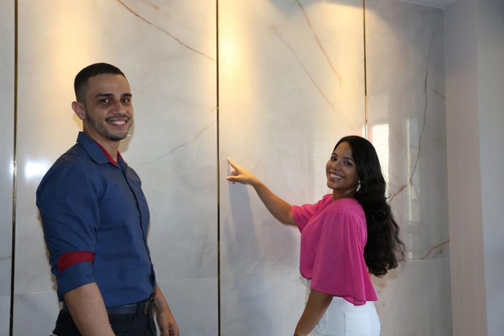 Os arquitetos e sócios Marcos Nunes e Marina Bogéa (Por Metro Quadrado) destacam as vantagens de aproveitar o Feirão Gigante Potiguar, concentrando todas as compras de materiais de qualidade em um só local, com ganho de tempo, de logística e economia em escala. Na foto, parede com revestimento em porcelanato de grande formato comprado na Potiguar.
