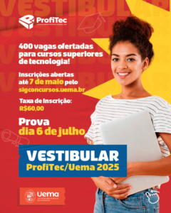 A Universidade Estadual do Maranhão (Uema) deu início, nesta segunda-feira (7), às inscrições para o Vestibular ProfiTec 2025. O processo seletivo oferece 400 vagas em nove cursos superiores de tecnologia, totalmente gratuitos e com aulas concentradas nos finais de semana, possibilitando que os estudantes consigam conciliar os estudos com outras atividades.
